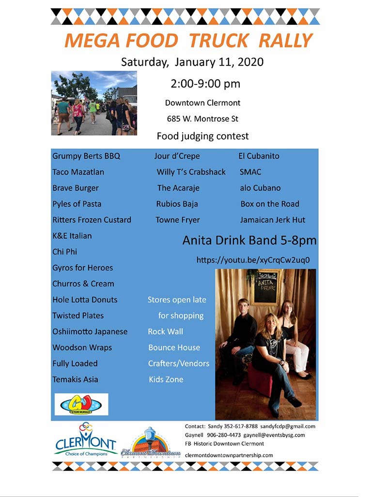 Downtown Clermont Mega Food Truck Rally will take place Saturday, January 11 from 2 pm – 9 pm. There will be a wide variety of food, entertainment by Anita Drink Bank, a Rock Climbing Wall, Kid Zone, crafters, and vendors. Downtown shops will stay open late.