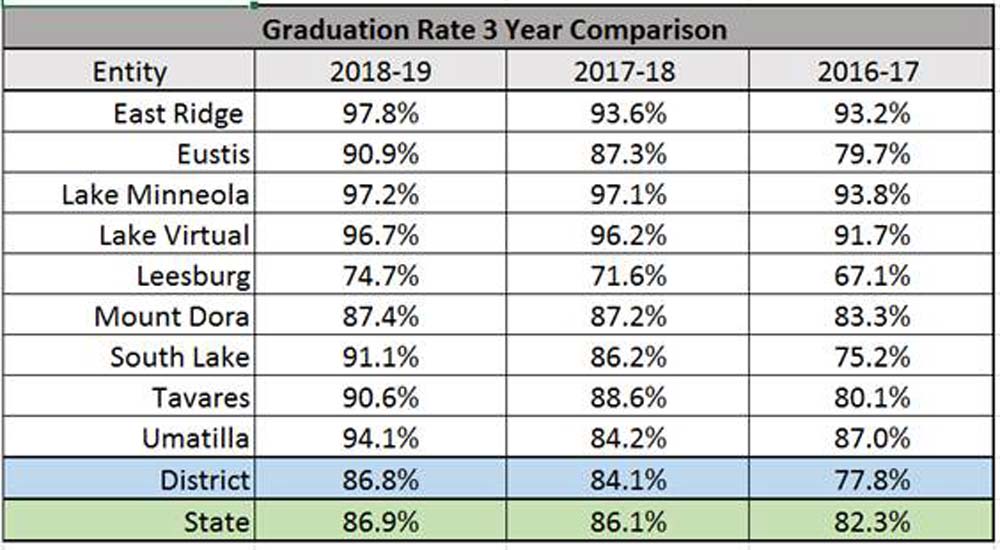 Lake’s increase is part of a statewide increase that state leaders touted with the release of the data. Gov. Ron DeSantis announced that Florida’s 2018-19 graduation rate rose to 86.9 percent, an increase of 0.8 percentage points over the previous year. “I applaud Florida’s students, parents and educators for their hard work and dedication that led to these increased graduation rates,” he said. “While these results are a positive mark of Florida’s upward progress, we cannot allow ourselves to become complacent. We must continue striving for educational excellence and making Florida the number one state in the nation for education.”