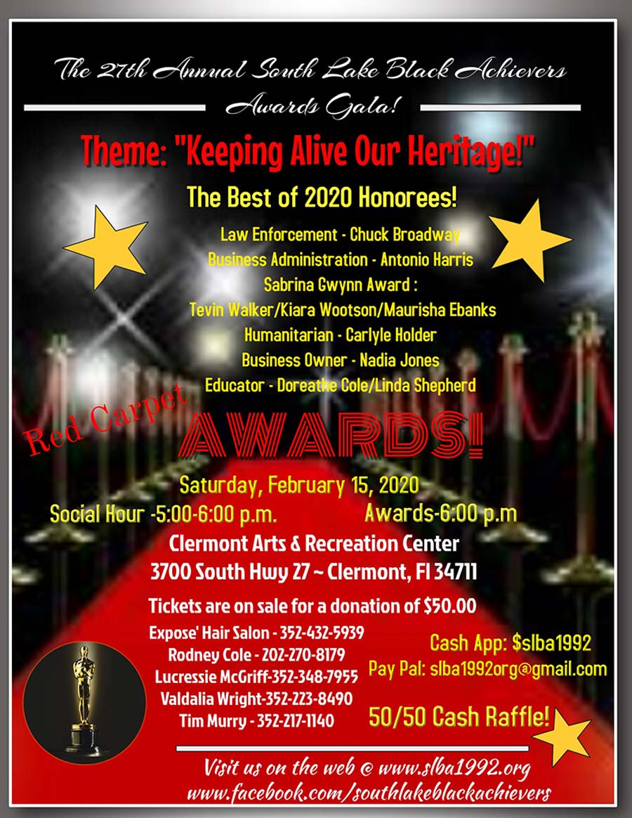 The Annual South Lake Black Achievers gala will be held on Saturday evening, February 15, at the Clermont Performing Arts Center, 3700 South Hwy 27, Clermont, beginning at 6:00 PM (social hour is from 5:00-6:00 pm). The theme for this occasion is “Keeping Alive Our Heritage!” People from the South Lake community will be recognized and honored for their achievement in their chosen careers. Tickets are on sale for a donation of $50 dollars per person.