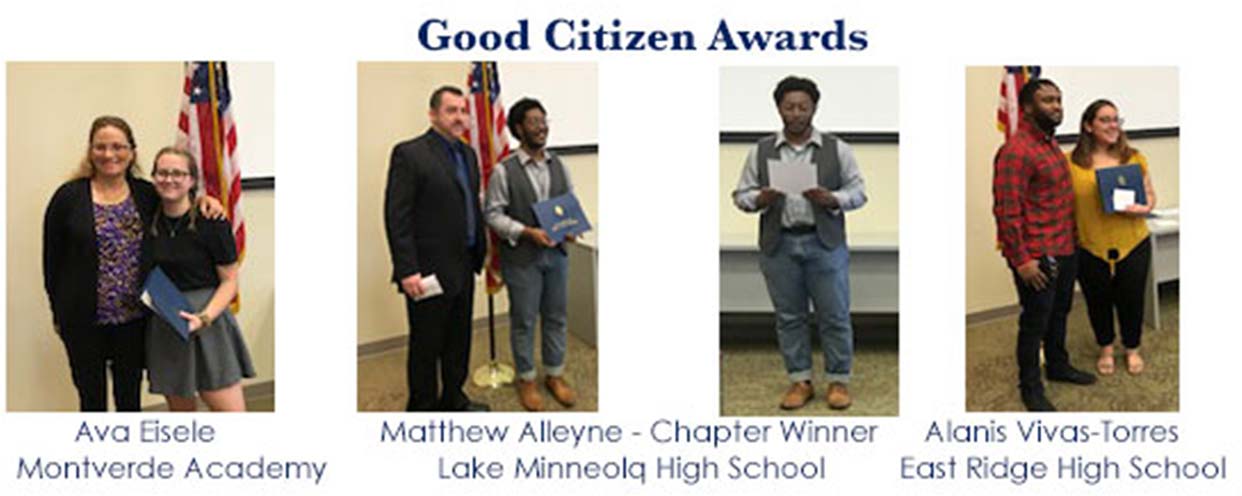 Good Citizens Award-winning students are Ava Eisner, Montverde Academy; Matthew Alleyne, Lake Minneola High School; Alanis Vivas-Torres, East Ridge High School. Matthew read his essay to all present at the ceremony. His essay will be submitted to the DAR State competition.