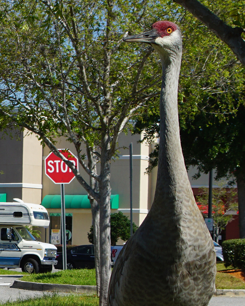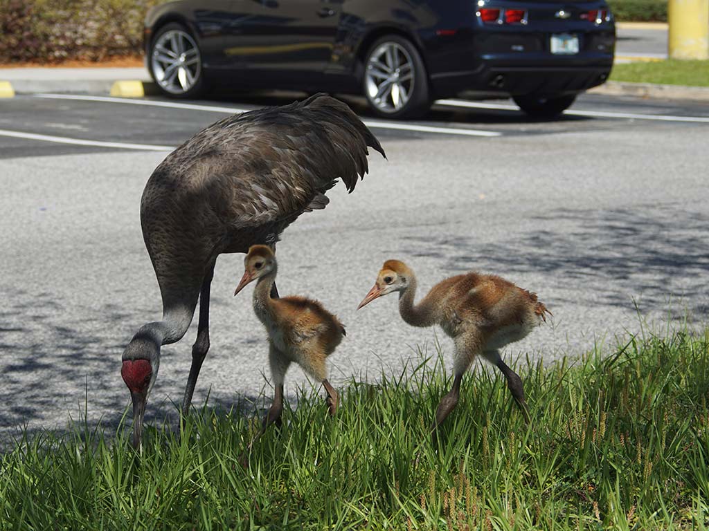 One day before Florida’s statewide lockdown went into effect, a handful of customers at Clermont Landing got a special treat. The popular shopping center normally has a lot of traffic and a lot of people, but with the pandemic, nothing’s quite “normal” anymore, so there were only a few people in the right place at the right to time to enjoy the visit of a little family of Sandhill Cranes as the birds strolled about, sampling bugs and grubs from one landscape island to another.
