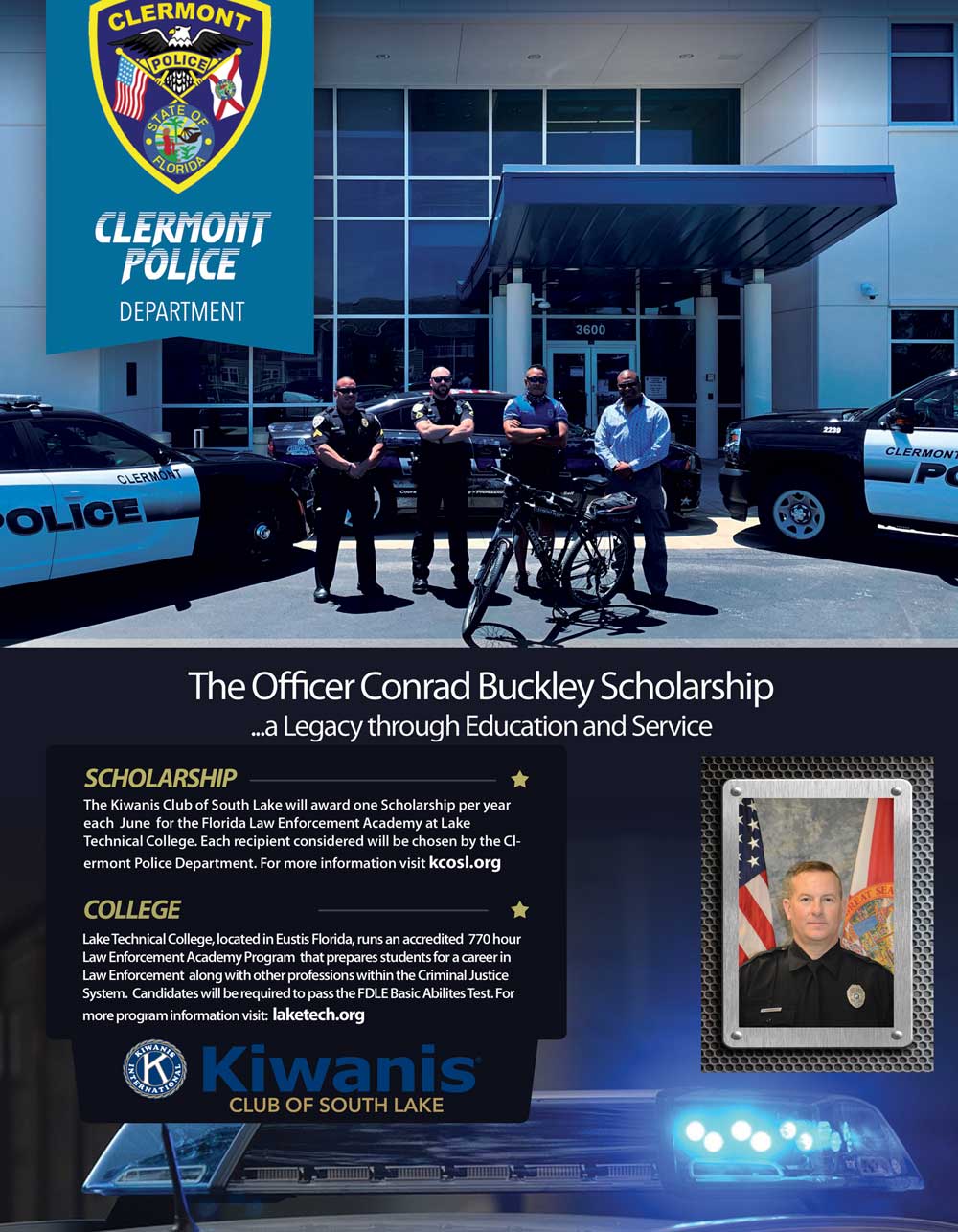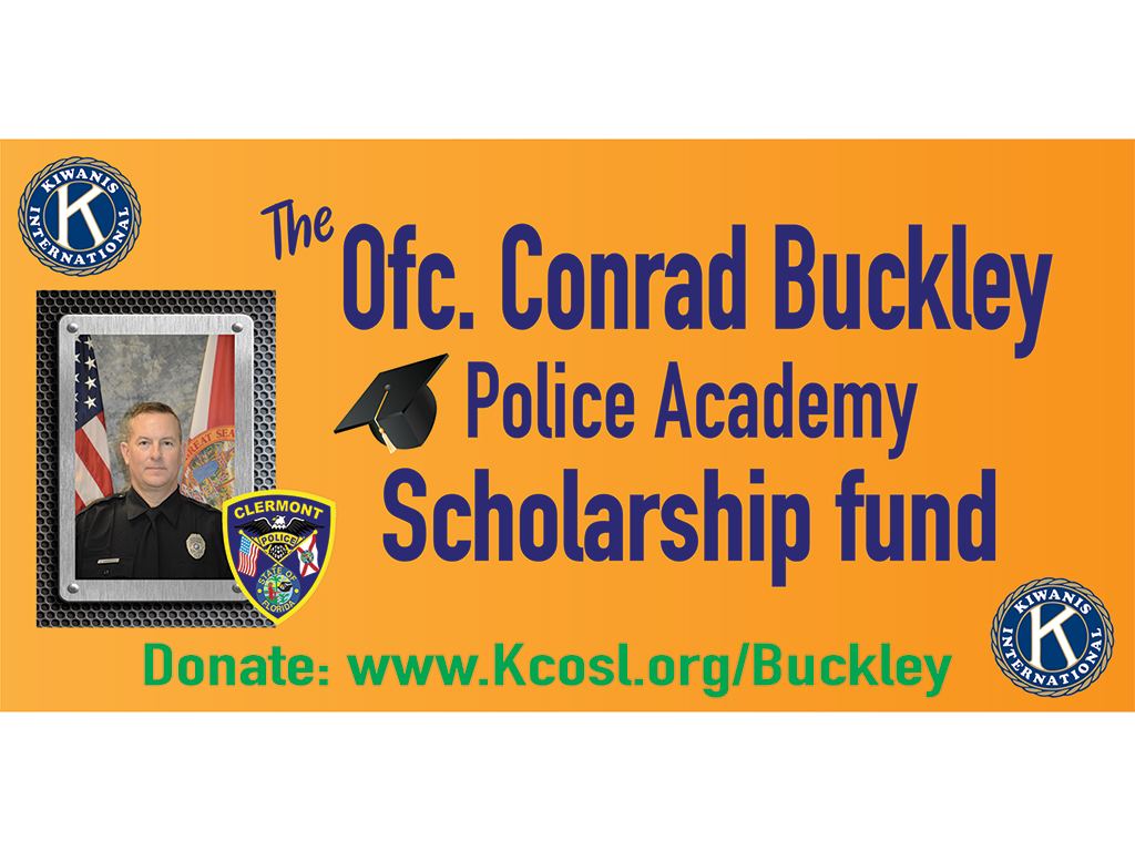 Leaving a Legacy – Each year the Officer Conrad Buckley Police Academy Scholarship will be sponsored by the Kiwanis Club of South Lake and the recipient will be chosen by the Clermont Police department. The recipient will attend the Lake Technical College, Florida Law Enforcement Academy where they will receive 770 hours of accredited police training.