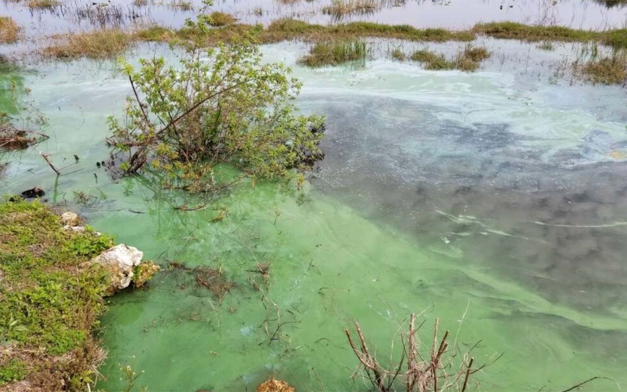 Blue-green algae, also known as cyanobacteria, are actually a group of photosynthetic bacteria that many people refer to as “pond scum.” Most species are buoyant and will float to the surface. Blue-green algae are present in all Florida freshwater lakes and ponds but can grow very quickly in number when the water is warm and enriched with nutrients like phosphorus or nitrogen. Nutrients can be carried into water bodies as a result of many human activities, including agriculture, discharge of stormwater or sewage, and use of phosphorus-based fertilizers and detergents.