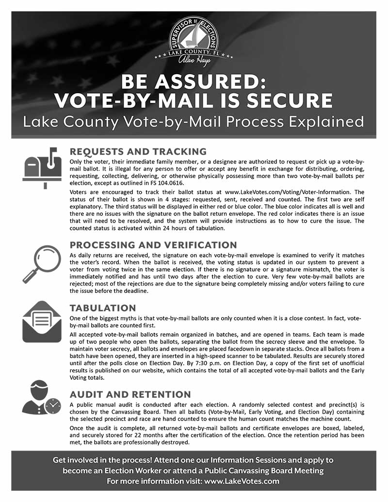 Voters who receive a mail ballot and decide to vote in person should bring their ballot to their polling location so it can be canceled. They will then be issued a new ballot to vote at the polls. Be assured voting by mail (formerly absentee voting) is a well-established process in Florida. Many safeguards are in place to ensure your ballot is secure. To learn more about vote-by-mail processing in Lake County, please review the Vote-by-Mail Infographic posted on the homepage at www.LakeVotes.com. Additional voter education resources are available including a video with Supervisor Hays outlining how to request a vote-by-mail ballot and how the ballots are processed once received in their office. Voters may access the video by clicking the link: https://www.lakevotes.com/Educational-Resources. “Voters who have questions regarding voting by mail or any other voting option are welcome to call 352.343.9734 and our staff will be happy to assist,” Hays offered.