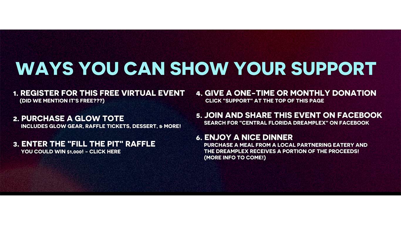 The event is free but you MUST register in advance. Registration, raffle entries, and more information on the evening can be found at www.CFLDreamplex.com/glow2020. The raffle, the “Fill the Pit Challenge” sponsored by Calloway Roofing, has a 1stprize of $1,000 cash, the 2nd prize of a 4 day/3 night experience at a Premier Westgate Resorts location, and a 3rd prize of a dinner for two at Texas Roadhouse of Clermont.