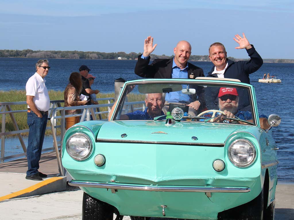 A driver takes City Councilmembers Tim Bates (top left) and Jim Purvis (bottom left) with City Manager Darren Gray (top right) for a drive/ride to test the boat ramp.
