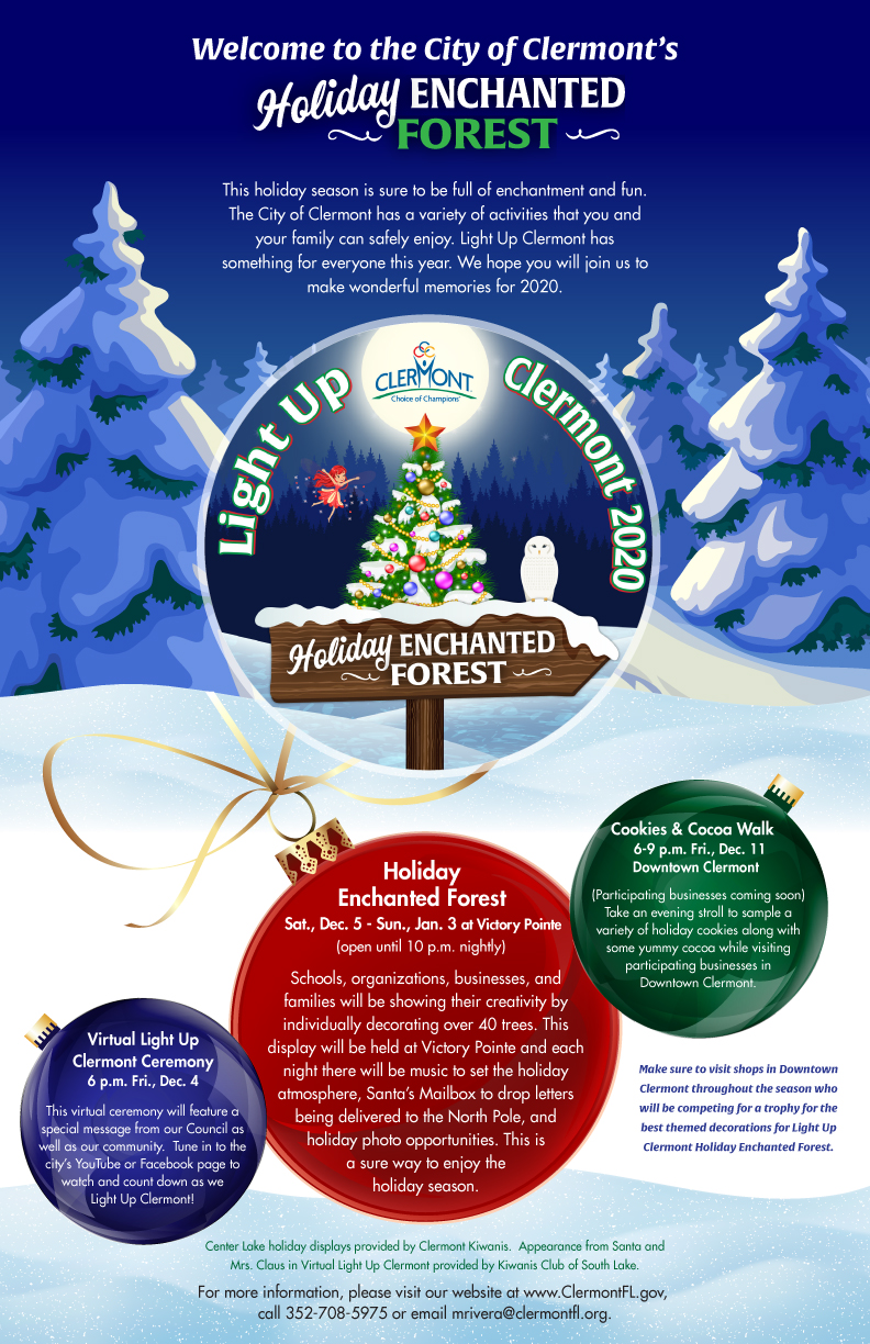 Light Up Clermont 2020 Virtual Tree Lighting Ceremony at City Hall Park kicked-off Clermont’s themed, Holiday Enchanted Forest on Friday, Dec. 4. at. 6 pm. Visit downtown Clermont and enjoy a variety of activities throughout the month.