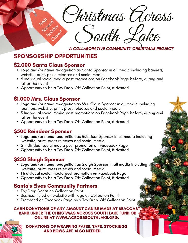 Please visit Christmas Across South Lake for information on making a donation, sponsorship opportunities, registering for assistance, a list of toy drop-off locations, Amazon toy wish list, and upcoming events.