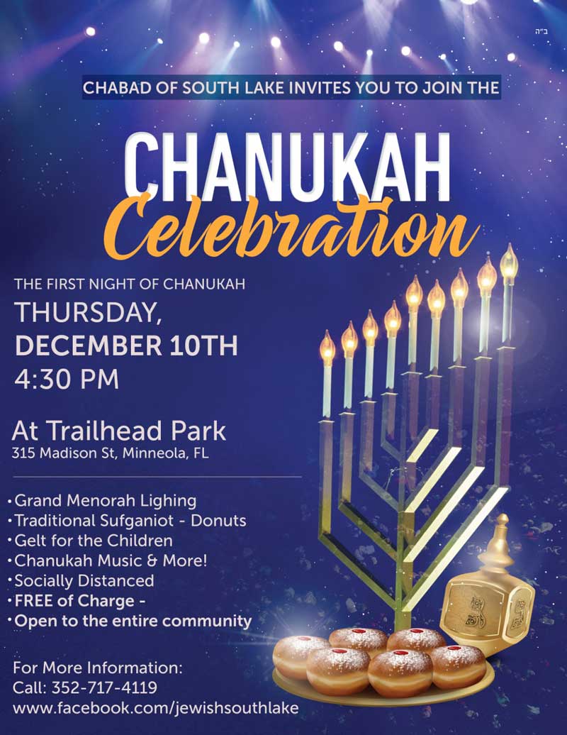 As the holiday of Chanukah is fast approaching, the Dubinskys are excited to announce that they will be hosting a Chanukah celebration in an outdoor socially distanced setting for the entire community. The event will take place at Trailhead Park in Minneola and will be graced with the presence of First Responders. They are looking forward to connecting with the community at this exciting celebration of the ‘Festival of Lights!’