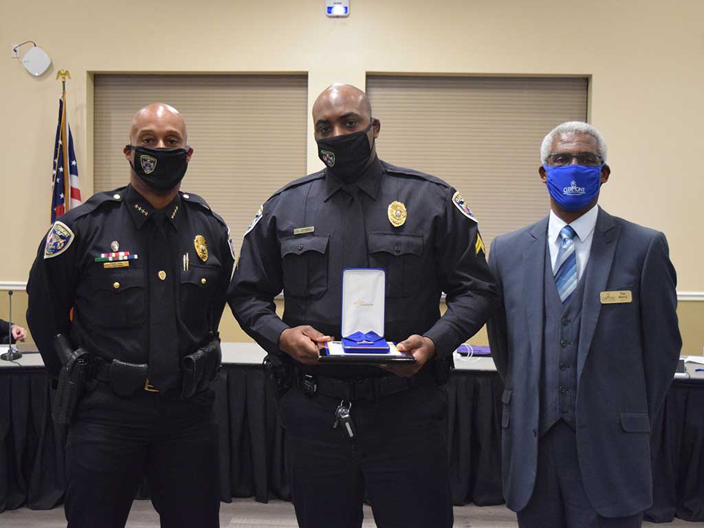 He is being recognized for providing exemplary leadership and for his quick decision making during a large fight that occurred at an event hall where several gunshots were heard. His swift actions and planning under stress were recognized as saving many lives and preventing any serious injuries.