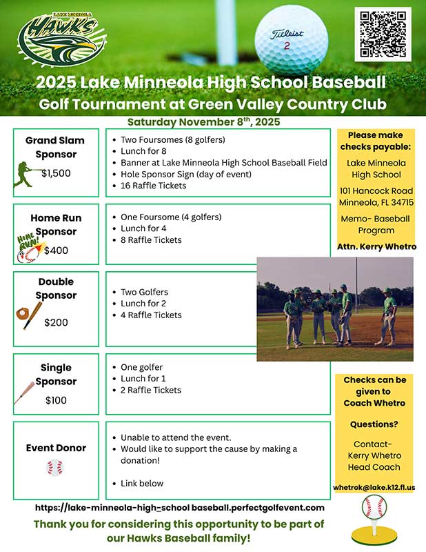 The Lake Minneola High School Baseball Team is gearing up for its Annual Golf Tournament Fundraiser on Saturday, November 8, at Green Valley Country Club Golf Course.