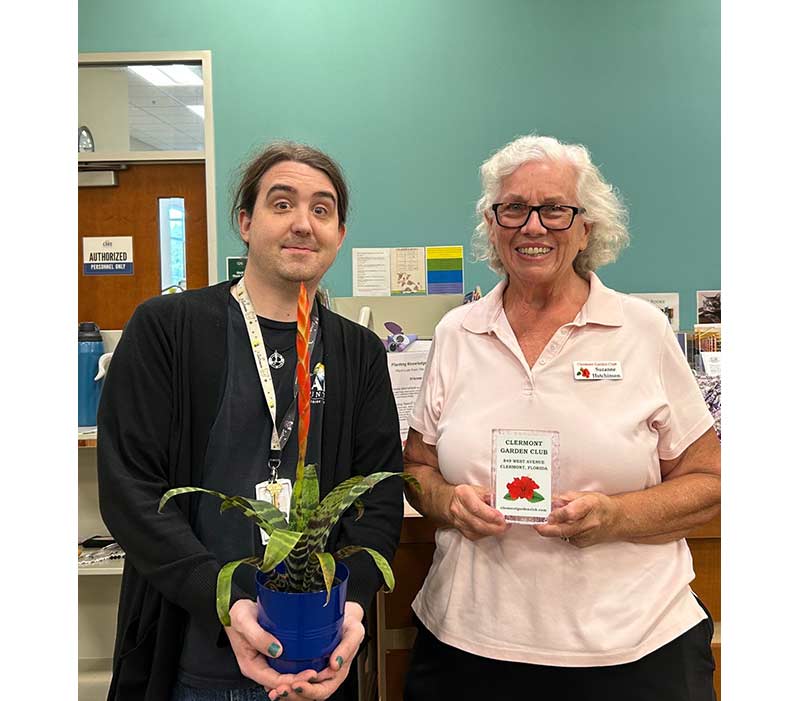 Library: Suzanne Hutchinson is pictured with Aeryn Taylor, Librarian Assistant II at Cooper Memorial Library, holding a Vriesea Bromeliad (“Flaming Sword”)].