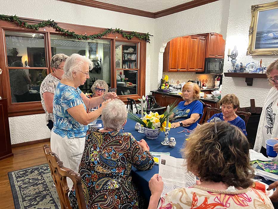 Terry demonstrated cross-stitching techniques and then guided members as they began their own projects. Each woman will have ample time to complete her piece before it is framed.