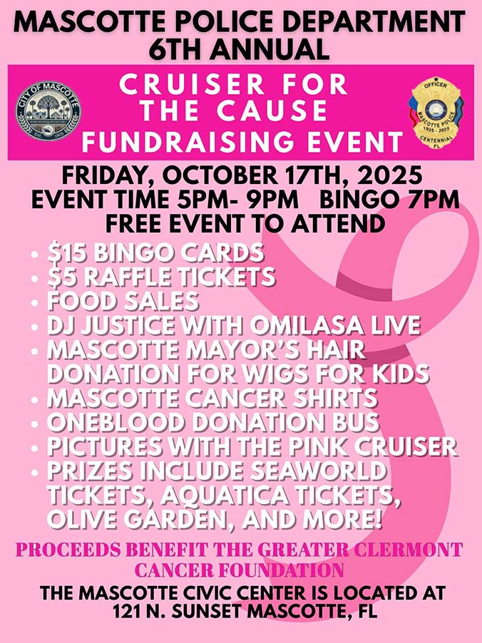 The Mascotte Police Department invites the community to come together for a night of fun, fellowship, and fundraising at the “Cruiser for the Cause” event on Friday, October 17, from 5 pm to 9 pm at 121 N. Sunset Avenue, Mascotte.