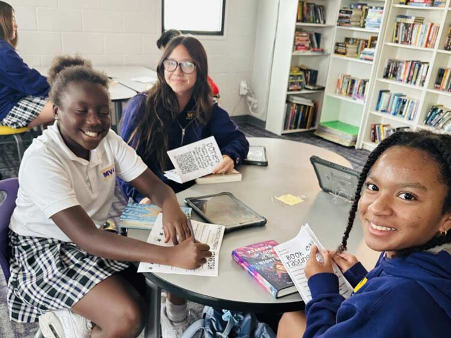 Sixth-grade students in Mrs. Parets’s ELA class participated in a “book tasting” activity where they sampled from 18 different fiction books, each connected to the question “How are people changed through their relationships and experiences?” With a variety of genres, topics, lengths, and Lexile levels, every reader had plenty of options to explore. Students were instructed to choose three books they hadn’t read before and were genuinely interested in.