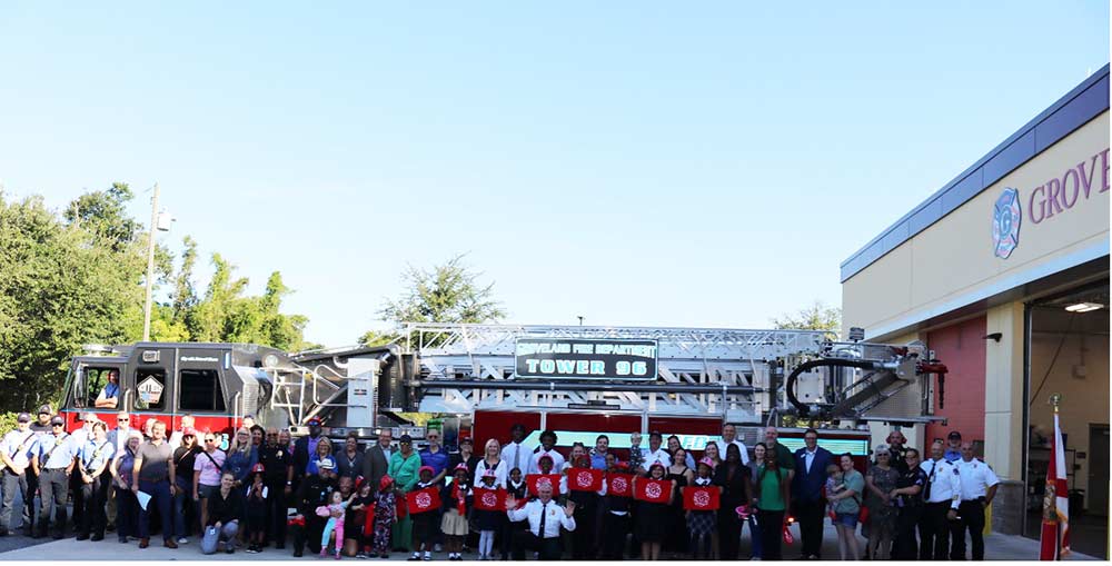 The City of Groveland proudly announces the arrival of its first tower truck, marking a major milestone in enhancing community safety and emergency response. The public joined the Groveland Fire Department for a ceremonial “wash down” and the official push-in of the new tower truck, a vital tool for high-angle rescues, fire suppression, and other emergency operations. Current and former council members, local community leaders, and residents came together to celebrate this important achievement.