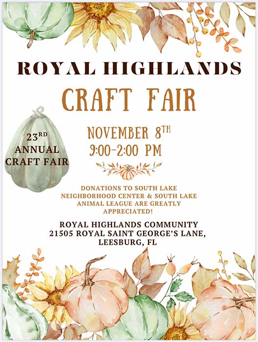 The 23rd Annual Royal Highlands Craft Fair will take place on Saturday, November 8, from 9 am to 2 pm at the Royal Highlands Community, located at 21505 Royal St. George’s Lane, Leesburg, FL.