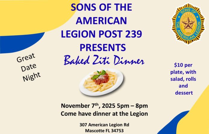 The Sons of the American Legion Post 239, located at 307 American Legion Road in Mascotte, invites the community to enjoy a delicious Baked Ziti Dinner on Friday, November 7, from 5 to 8 pm.