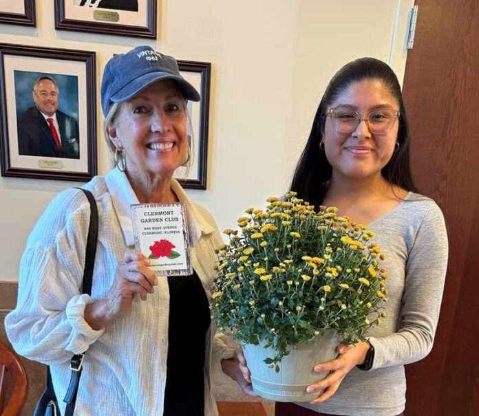 Gale Saunders loaned a potted chrysanthemum to Clermont City Hall. The chrysanthemum, or “mum”, belongs to the Asteraceae family which is the largest family of flowering plants and includes over 23,000 species. Florist mums are usually the ones that are sold indoors during the fall season. While technically a perennial, these are bred as annuals because chrysanthemums don’t have a rooting system that makes them capable of returning year after year, so planting these in an FL garden is not optimal. Mums need bright light and should be kept moist, but not wet. Trimming the spent flowers will help produce more buds.