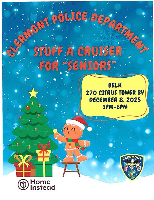 - “Stuff a Cruiser for Seniors,” partnered with Home Instead, on December 8th, 3PM – 6 PM at the Belk store, 270 Citrus Tower Blvd. With the initiative to bring holiday cheer to our seniors in need, participants are encouraged to donate new, unwrapped items such as clothing, slippers, toiletries, and blankets to help fill the cruiser with gifts for our senior-aged community members.