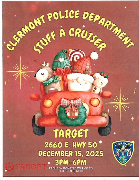 - “Stuff a Cruiser” on December 15th, from 3PM – 6PM at Target, 2660 East SR-50. New and unwrapped toys will be collected for children in need.