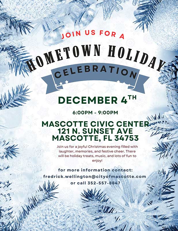 The holiday season will officially begin in Mascotte as the community gathers for the Tree Lighting and Hometown Holiday Celebration on Thursday, December 4, at the Mascotte Civic Center located at 121 N. Sunset Ave., Mascotte.