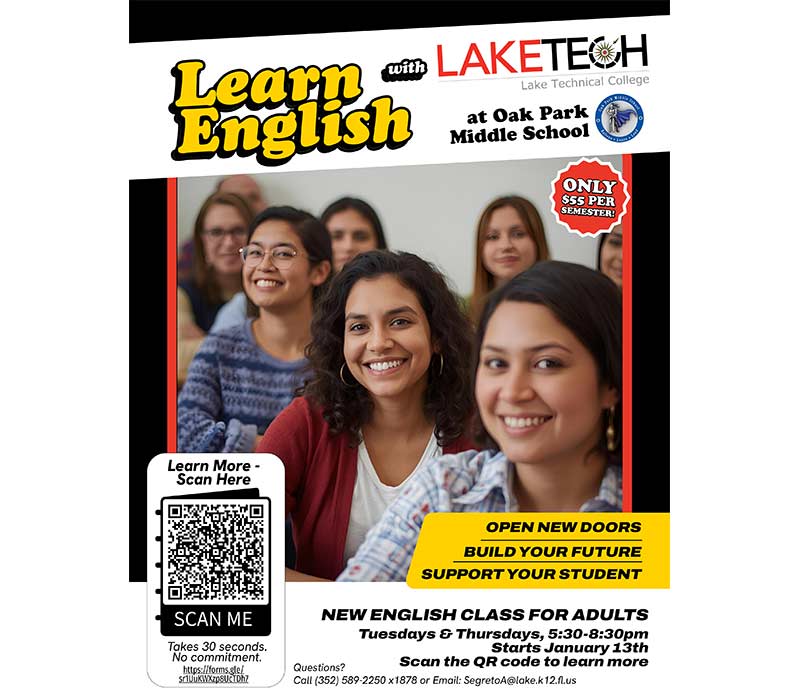 Lake Technical College, in collaboration with Lake County Schools, is launching a new English for Speakers of Other Languages (ESOL) class for adults at Oak Park Middle School. This initiative expands access to high-quality adult education and supports families—particularly those with students in local schools—by removing barriers to learning and opportunity.