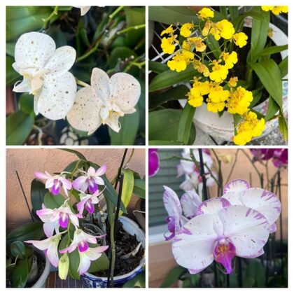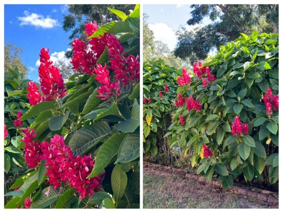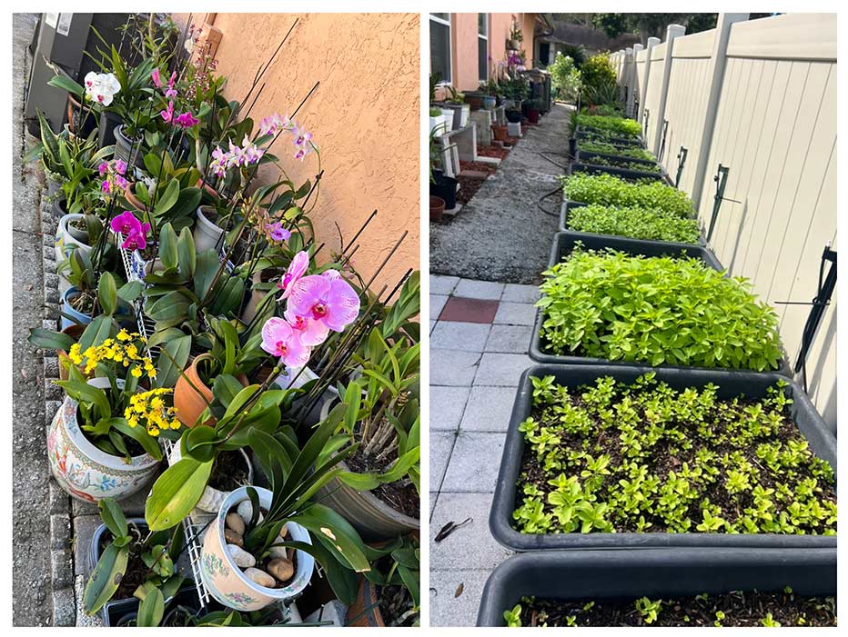 There is a striking dragon fruit plant (Selenicereus undatas) growing up a 10 foot tall tree trunk at the front of the house. The large brick patio on both sides of the front door are filled with big, gorgeous pots planted with bougainvillea, celosia (with the most vibrant ruby red color), various crown of thorns, and desert roses. A striking feature of the right side of the house adjacent to the street is a row of 9 foot tall Brazilian red-cloaks (Megaskepasma erythrochlamys) with magnificent burgundy blooms. To the left of the garage is a row of plumerias (Frangipani) which leads onto a long path into the backyard. To the right of that path, you are greeted by a row of succulents and multitude of exotic blooming orchids. On the left are potted pandan plants (Pandanusamaryllifolius, used in cooking) and multiple trays of potted mint (Mentha) and edible greens which Nyuget serves to veterans at the Vietnamese temple in Apopka. The path ends in a backyard with various fruiting plants: sugar apple (annona squamosa), grapefruit, mangoes, dragonfruit and more!