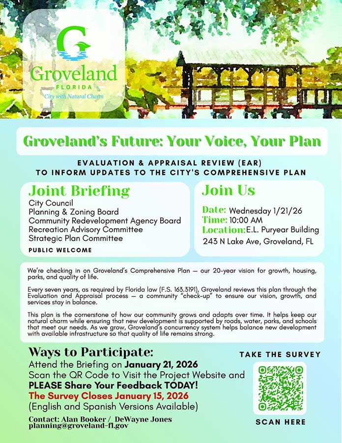The City of Groveland is inviting residents to help shape its future by participating in an upcoming joint briefing focused on updates to the city’s Comprehensive Plan—a long-range document that guides growth, development, and quality of life over the next 20 years.