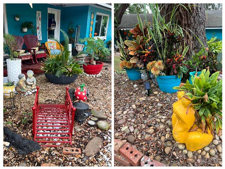 Rhonda and Carolyn love bright colors as evidenced by the cerulean blue paint they have chosen to make their home the most colorful house for blocks around. The front porch of the house is adorned with metal floral wall art and family heirlooms of gliders and handmade wooden and rattan chairs in grays, burgundy and eye-catching yellow. Surrounding the porch area are gorgeous potted plants including succulents in yellow/white planters and a large Buddha Belly plant (Jatropha podagrica) in a cherry-red pot. Cute garden figurines and a mini bridge (also in cherry red!) complement the look. A staghorn fern lays below one live oak tree to the left of the porch. Towards the street, the base of a tall elegant live oak tree is adorned with many plants in large pots of vibrant aqua, teal and turquoise. There is a rose, croton (Codiaeum variegatum), variegated ginger and snake plants (Dracaena trifasciata). The back side of the oak is blanketed with aloe and other succulents…under the watchful eye of a large whimsical yellow frog planter that holds a Chinese Evergreen (Aglaonema Tigress).