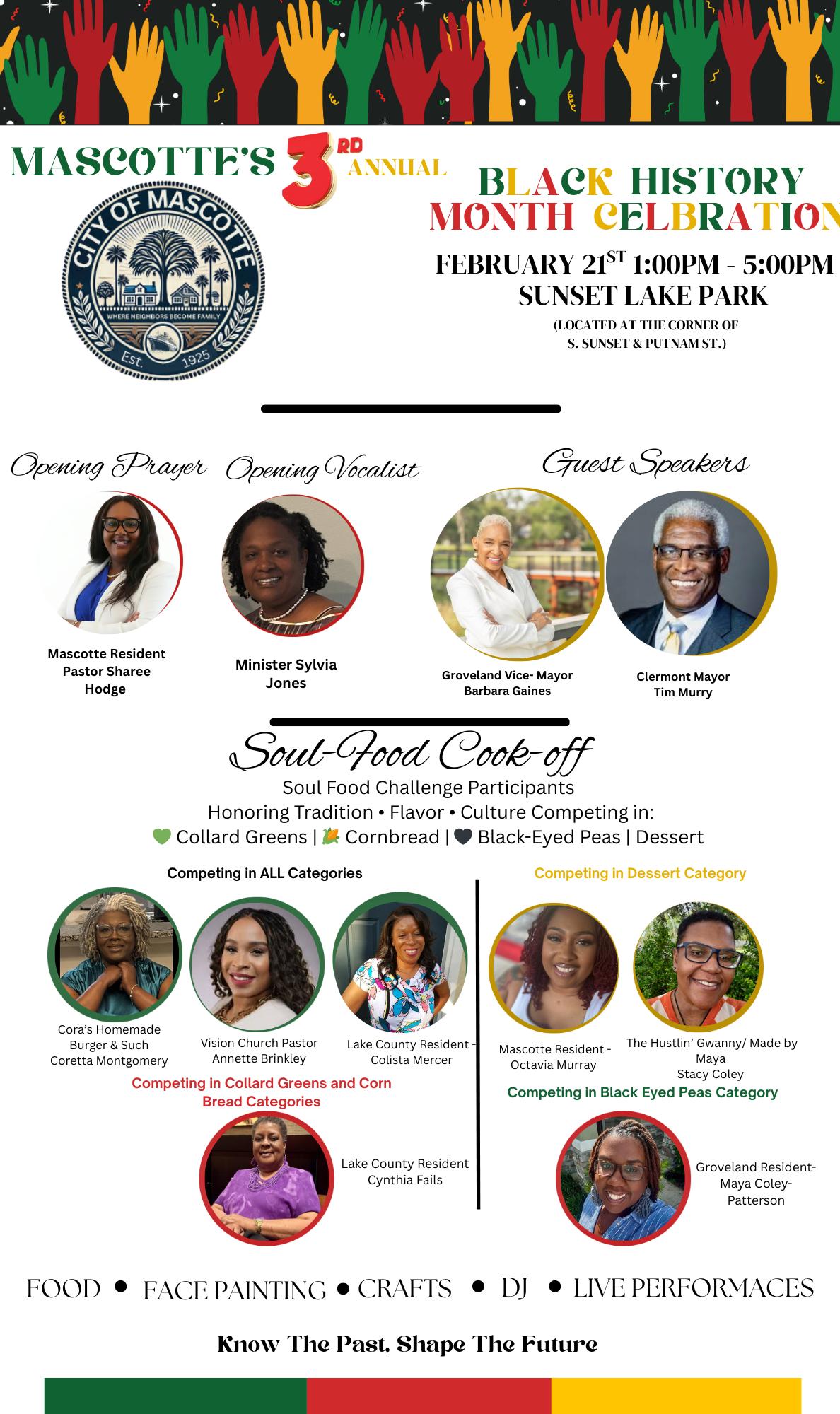 Make plans to join the Mascotte’s 3rd Annual Black History Month Celebration on February 21 from 1:00 pm to 5:00 pm at Sunset Lake Park, located at the corner of S. Sunset Avenue and Putnam Street.