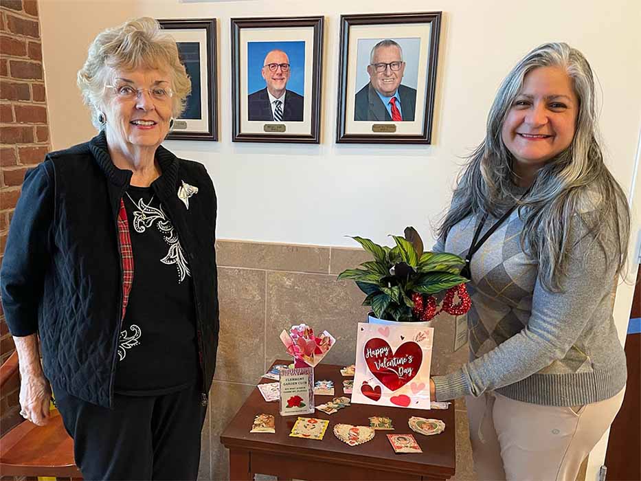 Sue Randall, pictured with Idialis Chapano (Permit Technician at Clermont City Hall) loaned a calathea as well as vintage Valentine cards.