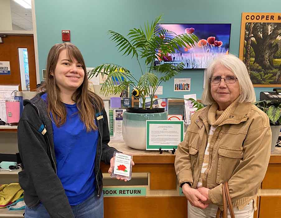 Letizia Isaia, pictured with a Librarian Assistant at Cooper Memorial Library, loaned a parlor palm.