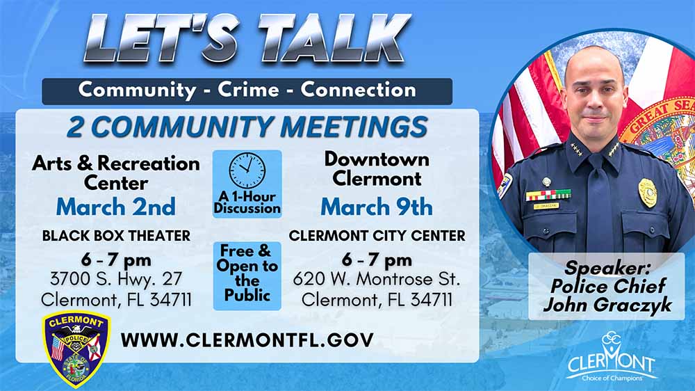 The community is invited to attend an engaging and informative Community Meeting with Police Chief John Graczyk. The conversation will focus on community safety, crime trends, and ways residents can stay connected as Clermont continues to shine as the Choice of Champions™.
