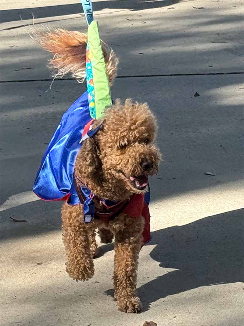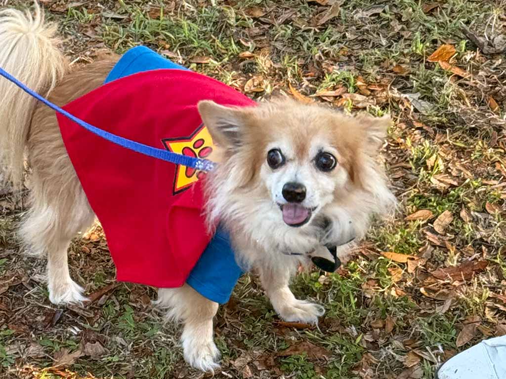 The annual costume contest themed this year as “Su-Paw-Heros,” brought out 16 entries. Costumes and supporting props encouraged the best in handler imagination and creativity as the pups strutted their stuff down the grassy runway. The contest was led by Master of Ceremonies, Jay Peterson of Jayslights, along with a panel of judges composed of representatives from the community, including Pat Caracciolo, Clermont Police Officer Erin Razo, and Chuck Seaver. All the costumed cuties were winners in the judge’s eyes but three “pawmazing” pups stood out in categories that included Best Overall, Most on Theme, and Most Creative.