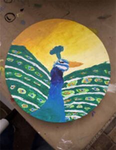 Bryson’s artwork is known for being bright and expressive, driven by a vivid imagination. He often develops original concepts—such as a dove swimming in a coral reef—that blend elements of realism with unexpected, imaginative worlds. Color has long been central to his expression; even before he spoke, he communicated through art. His pieces reflect a contemporary style that is both joyful and richly layered.