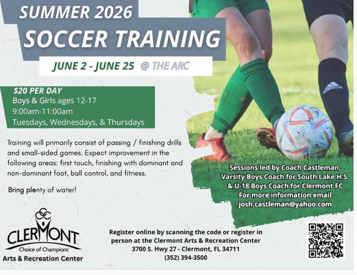 The City of Clermont is offering summer soccer training at the Clermont Arts and Recreation Center for boys and girls ages 12-17.