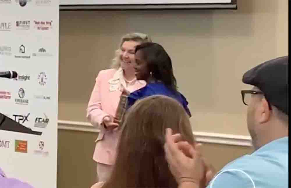 Pictured: Donna Kirtland presents the Ray Goodgame Scholarship Award to student Jasmine Gaines