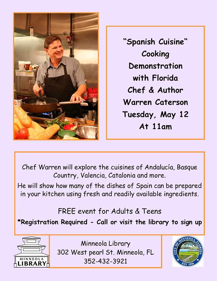 Join Chef Warren on Tuesday, May 12 at 11am as he shares dozens of kitchen tips, cooking hints and humorous anecdotes about the joys and challenges of cooking for two. Chef Warren will explore the cuisines of Andalucía, Basque Country, Valencia, Catalonia (where the first cookbook in Spain was written) and more. He will show how many of the dishes of Spain can be prepared in your own kitchen using fresh and readily available ingredients.