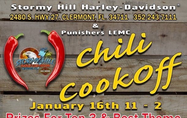 Stormy Hill Harley-Davidson is hosting a Chili Cookoff on January 16 from 11 am - 2 pm. Prizes will be given for the top...