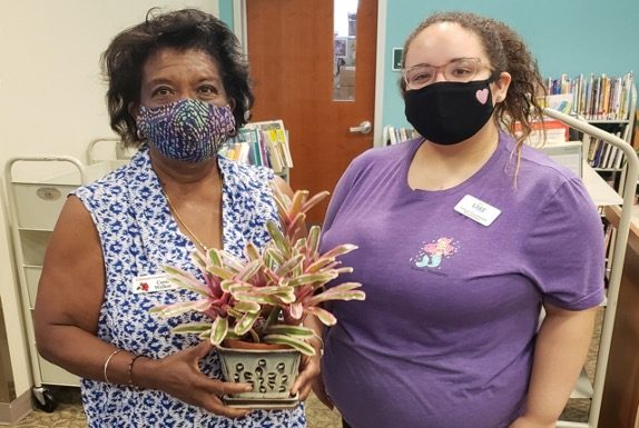 Clermont Garden Club member, Carol Walker is shown with Cooper Memorial Librarian, Ivanna Villanueva. Carol has brought a Bromeliad Neoregelia (pink mini) to display...